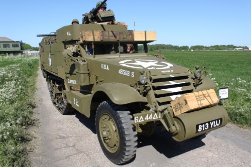 Saturday’s road run to the old airfield at Melbourne was well attended by a good cross section of vehicles. Malcolm Dawson, Durham/Tyne Tees, drove his just completed 1942 M3A1 Halftrack. I remember seeing photos of it 2 years ago as it arrived from Rudi Pomm in Belgium as, he says, “7 tons of scrap”. Now in superb condition it won the prize for Best Wartime vehicle. Young participants included Hugo hunter’s niece looking the part as Rosie the Riveter. Chris Smyth’s road run was brief. His Quad was later recovered, and the problem resolved with a new condenser ready for the trip home with his 25 pdr behind. |